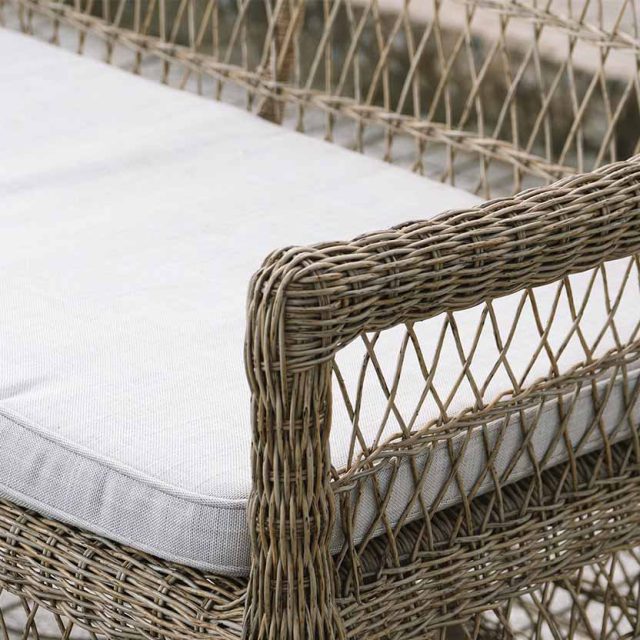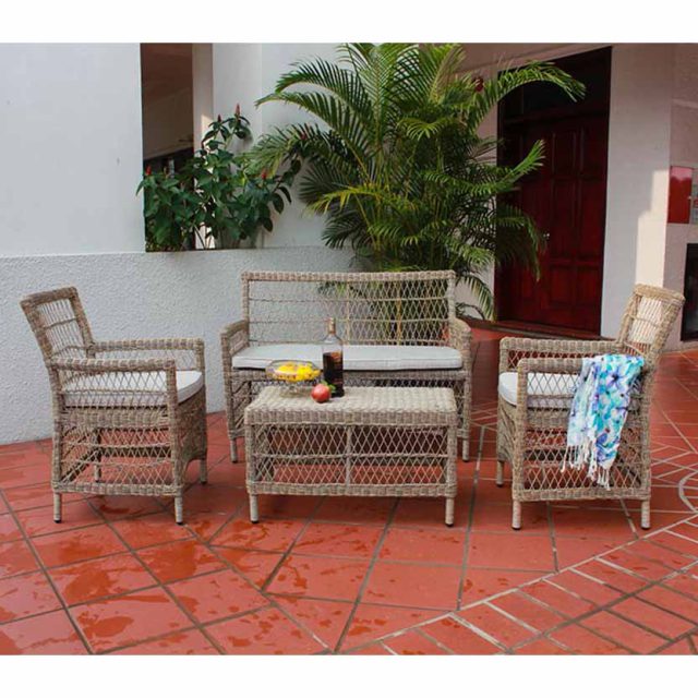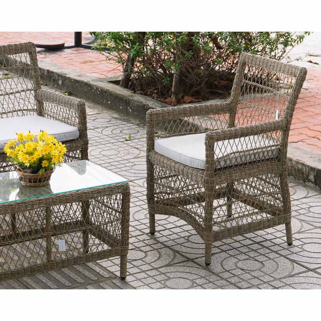 Bộ bàn ghế Gloria sở hữu kiểu dáng gọn gàng, cân đối, bao gồm sofa băng dài, hai ghế đơn và bàn trà chữ nhật. Phần khung được thiết kế chắc chắn, các đường đan đều tay, tạo cảm giác thanh thoát nhưng vẫn vững chãi. Tông màu nâu xám tự nhiên giúp sản phẩm dễ dàng kết hợp với nhiều phong cách không gian, từ sân vườn biệt thự, ban công chung cư, đến resort, quán café ngoài trời.