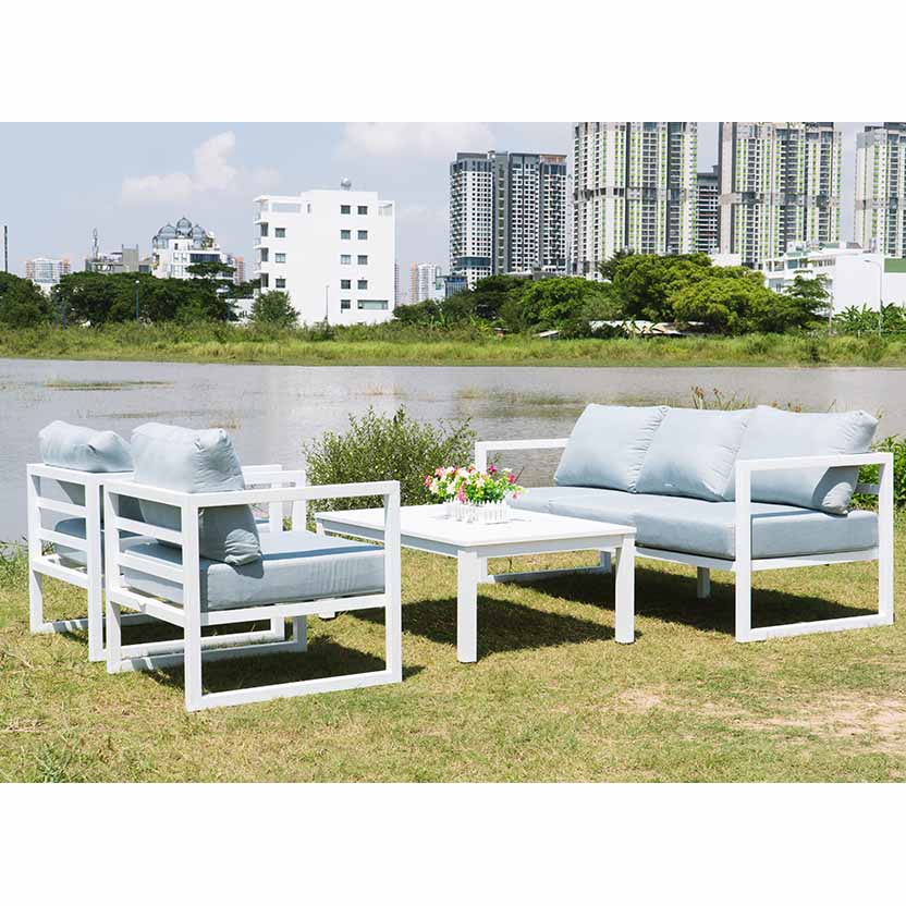 Bộ sản phẩm bao gồm sofa băng dài, ghế đơn và bàn trà thấp, giúp tạo nên một khu vực tiếp khách hoặc thư giãn ngoài trời đầy đủ công năng nhưng vẫn rất hài hòa về mặt thẩm mỹ.