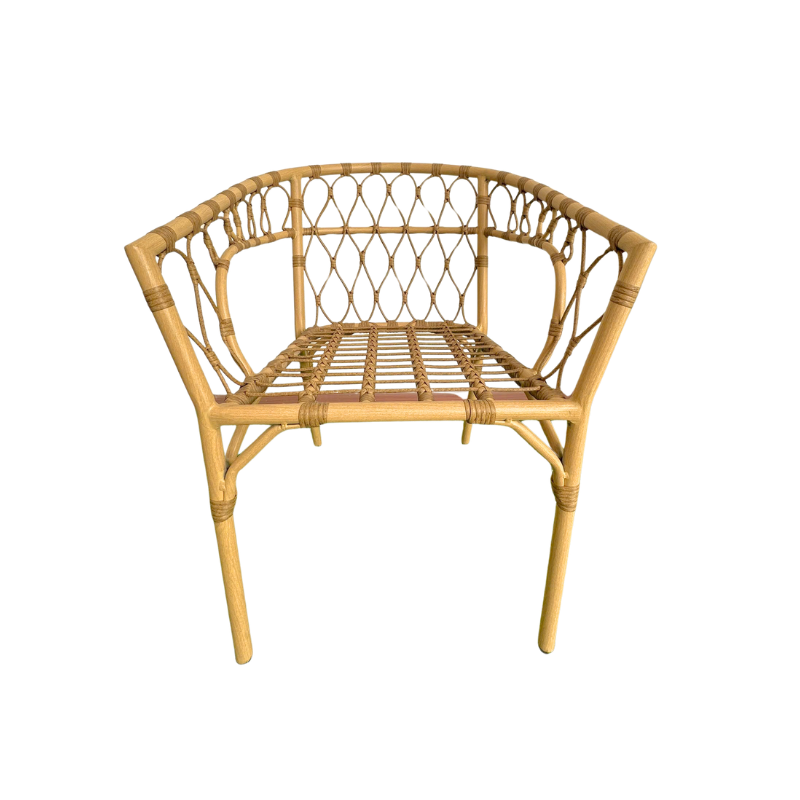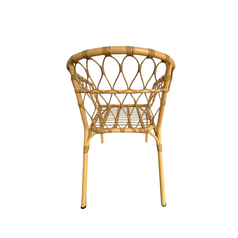 Phần thân ghế được đan thủ công từ sợi mây nhựa chất lượng cao, kết hợp giữa sợi tròn 7mm và sợi dẹt 7mm. Sự phối hợp này không chỉ giúp tăng độ chắc chắn cho kết cấu mà còn tạo nên hiệu ứng thị giác sinh động, với các đường đan đan xen nhịp nhàng và tinh tế. Chất liệu mây nhựa có khả năng chống tia UV, không bị giòn gãy hay phai màu khi sử dụng lâu dài ngoài trời, đồng thời dễ dàng vệ sinh, giúp sản phẩm luôn giữ được vẻ ngoài như mới theo thời gian.