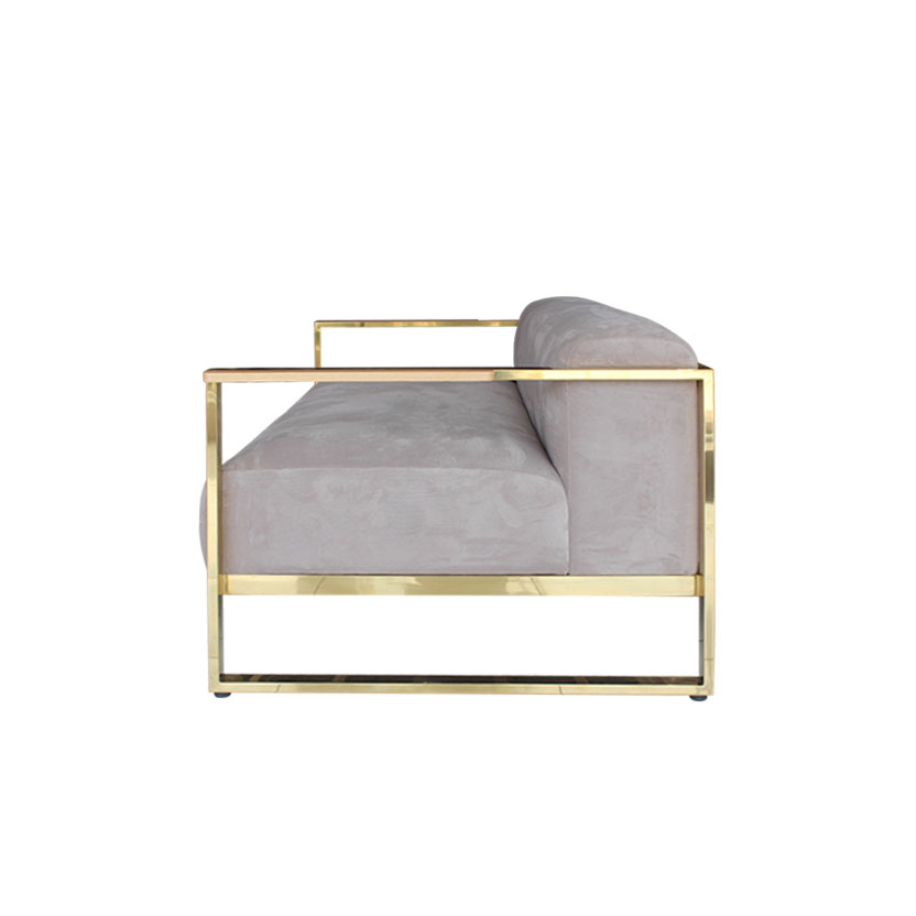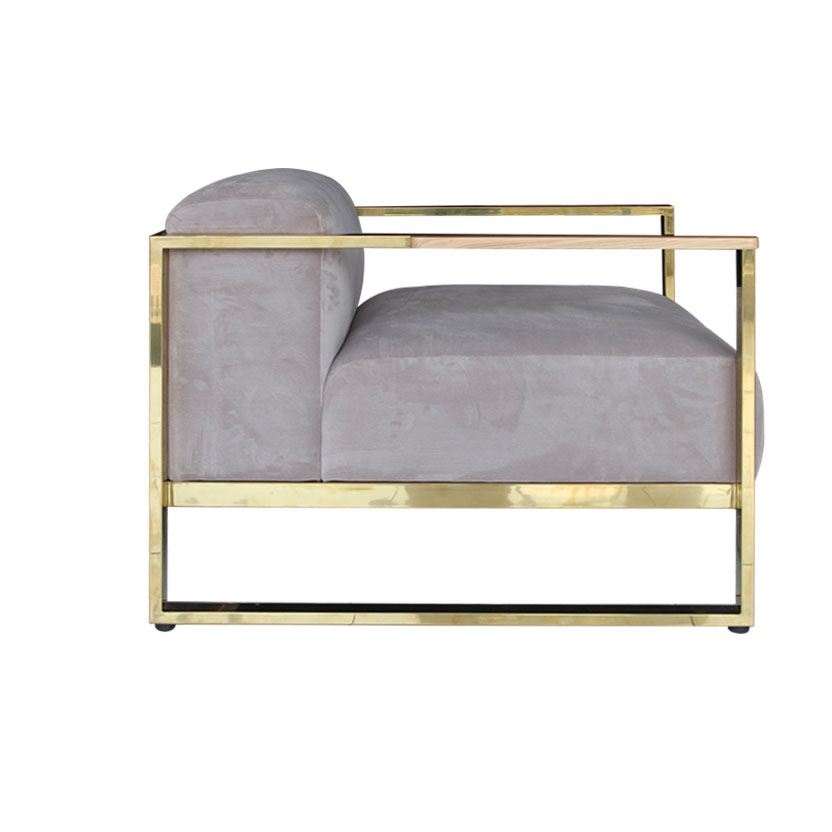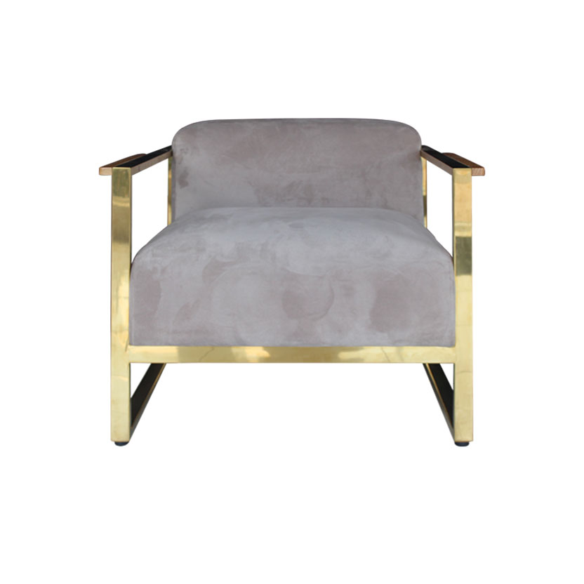 Phần khung kim loại được hoàn thiện với bề mặt ánh vàng tinh tế, không quá bóng nhưng đủ nổi bật để tạo điểm nhấn. Tay vịn và chân ghế được thiết kế liền mạch, tạo cảm giác chắc chắn và vững chãi, đồng thời mang lại nét sang trọng đặc trưng thường thấy trong các không gian cao cấp như lounge, sảnh chờ khách sạn hay căn hộ phong cách sang trọng hiện đại. Tông màu trung tính của lớp vải bọc giúp ghế Andrew dễ dàng phối hợp với nhiều bảng màu nội thất khác nhau, từ gam sáng thanh lịch đến gam trầm ấm áp.